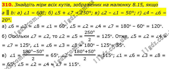 Знайдіть міри всіх кутів, зображених на малюнку 8.15, якщо а ∥ b: а) ∠1 = 60°; б) ∠5 + ∠7 = 250°; в) ∠2 – ∠1 = 50°; г) ∠4 – ∠6 = 20°. а) ∠6 = ∠3 = ∠8 = ∠1 = 60°, ∠5 = ∠2 = ∠4 = ∠7 = 180° – 60° = 120°. б) Оскільки ∠7 = ∠2, то ∠2 = ∠5 = (250°)/2 = 125°. Отже, ∠5 = ∠2 = ∠4 = = ∠7 = 125°, ∠1 = ∠6 = ∠3 = ∠8 = 180° – 125°= 55°. в) ∠1 = (180°-50°)/2 = 65°, ∠2 = (180°+50°)/2 = 115°; ∠1 = ∠6 = ∠3 = ∠8 = = 65°, ∠5 = ∠2 = ∠4 = ∠7 = 115°.