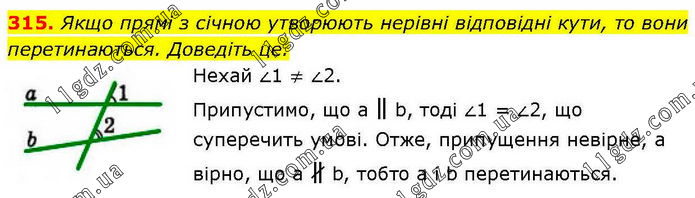Якщо прямі з січною утворюють нерівні відповідні кути, то вони перетинаються. Доведіть це. Нехай ∠1 ≠ ∠2. Припустимо, що а ∥ b, тоді ∠1 = ∠2, що суперечить умові. Отже, припущення невірне, а вірно, що а ∦ b, тобто а і b перетинаються.