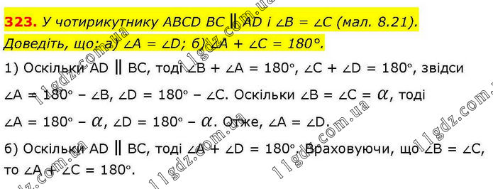 У чотирикутнику ABCD BC ∥ AD і ∠B = ∠C (мал. 8.21). Доведіть, що: а) ∠A = ∠D; б) ∠A + ∠C = 180°. 1) Оскільки АD ∥ ВС, тоді ∠В + ∠А = 180°, ∠С + ∠D = 180°, звідси ∠А = 180° – ∠В, ∠D = 180° – ∠С. Оскільки ∠В = ∠С = α, тоді ∠А = 180° – α, ∠D = 180° – α. Отже, ∠А = ∠D. б) Оскільки АD ∥ ВС, тоді ∠А + ∠D = 180°. Враховуючи, що ∠В = ∠С, то ∠А + ∠С = 180°.