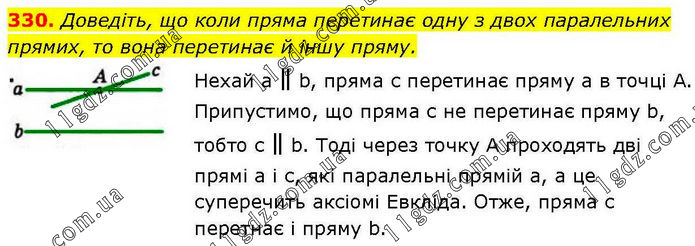 Доведіть, що коли пряма перетинає одну з двох паралельних прямих, то вона перетинає й іншу пряму. Нехай а ∥ b, пряма с перетинає пряму а в точці А. Припустимо, що пряма с не перетинає пряму b, тобто с ∥ b. Тоді через точку А проходять дві прямі а і с, які паралельні прямій а, а це суперечить аксіомі Евкліда. Отже, пряма с перетнає і пряму b.