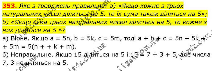 Яке з тверджень правильне: а) «Якщо кожне з трьох натуральних чисел ділиться на 5, то їх сума також ділиться на 5»; б) «Якщо сума трьох натуральних чисел ділиться на 5, то кожне з них ділиться на 5 »? а) Вірне. Якщо а = 5n, b = 5k, c = 5m, тоді a + b + c = 5n + 5k + + 5m = 5(n + + k + m). б) Неправильне. Якщо 15 ділиться на 5 і 15 = 7 + 3 + 5, але числа 7, 3 не діляться на 5.