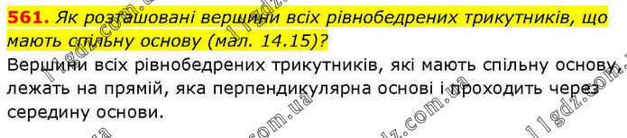 Як розташовані вершини всіх рівнобедрених трикутників, що мають спільну основу (мал. 14.15)? Вершини всіх рівнобедрених трикутників, які мають спільну основу, лежать на прямій, яка перпендикулярна основі і проходить через середину основи.