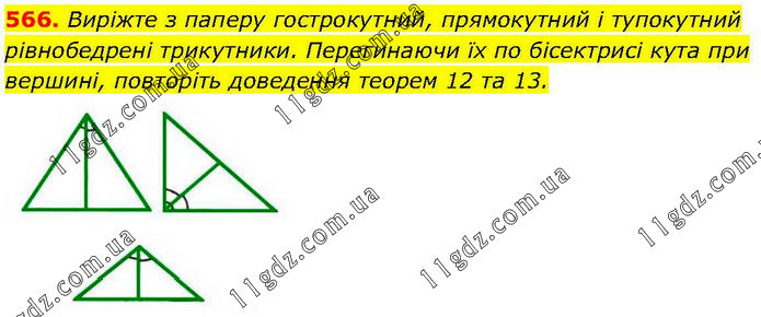 Виріжте з паперу гострокутний, прямокутний і тупокутний рівнобедрені трикутники. Перегинаючи їх по бісектрисі кута при вершині, повторіть доведення теорем 12 та 13.