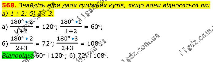Знайдіть міри двох суміжних кутів, якщо вони відносяться як: а) 1 : 2; б) 2 : 3. а) (180° • 2)/(1+2) = 120°; (180° •1)/(1+2) = 60°; б) (180° • 2)/(2+3) = 72°; (180° •3)/(2+3) = 108°. Відповідь: 60° і 120°; б) 72° і 108°.