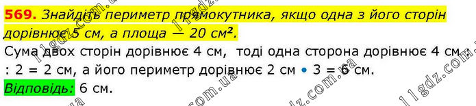 Знайдіть периметр прямокутника, якщо одна з його сторін дорівнює 5 см, а площа — 20 см2. Сума двох сторін дорівнює 4 см, тоді одна сторона дорівнює 4 см : : 2 = 2 см, а його периметр дорівнює 2 см • 3 = 6 см. Відповідь: 6 см.