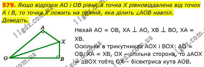 Якщо відрізки AO і OB рівні, а точка X рівновіддалена від точок А і В, то точка X лежить на прямій, яка ділить ∠AOB навпіл. Доведіть. Нехай АО = ОВ, ХА ⊥ АО, ХВ ⊥ ВО, ХА = ХВ. Оскільки в трикутниках АОХ і ВОХ: АО = ОВ, ХА = ХВ, ОХ – спільна сторона, то ∆АОХ = ∆ВОХ тобто ОХ – бісектриса кута АОВ.