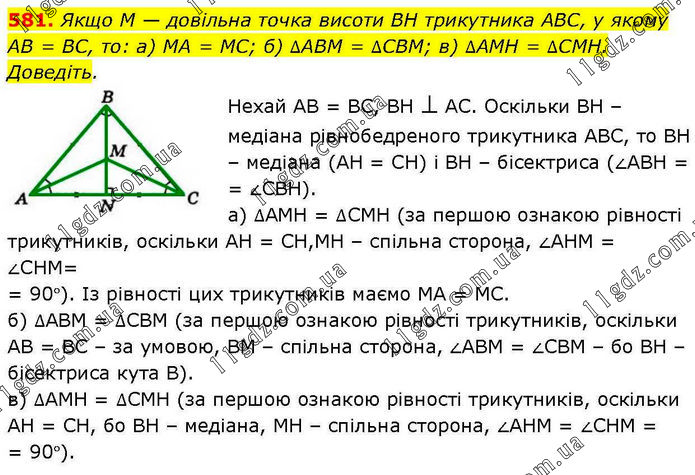 Якщо M — довільна точка висоти BH трикутника ABC, у якому AB = BC, то: a) MA = MC; б) ∆ABM = ∆CBM; в) ∆AMH = ∆CMH. Доведіть. Нехай АВ = ВС, ВН ⊥ АС. Оскільки ВН – медіана рівнобедреного трикутника АВС, то ВН – медіана (АН = СН) і ВН – бісектриса (∠АВН = ∠СВН). а) ∆АМН = ∆СМН (за першою ознакою рівності трикутників, оскільки АН = СН,МН – спільна сторона, ∠АНМ = ∠СНМ = 90°). Із рівності цих трикутників маємо МА = МС. б) ∆АВМ = ∆СВМ (за першою ознакою рівності трикутників, оскільки АВ = ВС – за умовою, ВМ – спільна сторона, ∠АВМ = ∠СВМ – бо ВН – бісектриса кута В). в) ∆АМН = ∆СМН (за першою ознакою рівності трикутників, оскільки АН = СН, бо ВН – медіана, МН – спільна сторона, ∠АНМ = ∠СНМ = 90°).