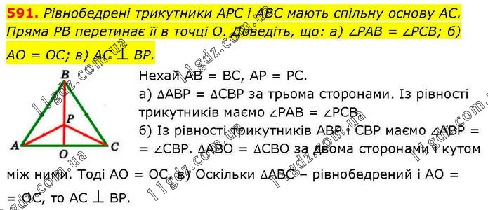 Рівнобедрені трикутники APC і ABC мають спільну основу AC. Пряма PB перетинає її в точці О. Доведіть, що: а) ∠PAB = ∠PCB; б) AO = OC; в) AC ⊥ BP. Нехай АВ = ВС, АР = РС. а) ∆АВР = ∆СВР за трьома сторонами. Із рівності трикутників маємо ∠РАВ = ∠РСВ. б) Із рівності трикутників АВР і СВР маємо ∠АВР = ∠СВР. ∆АВО = ∆СВО за двома сторонами і кутом між ними. Тоді АО = ОС. в) Оскільки ∆АВС – рівнобедрений і АО = ОС, то АС ⊥ ВР.