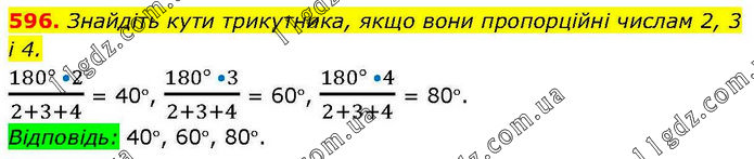 Знайдіть кути трикутника, якщо вони пропорційні числам 2, 3 і 4. (180° • 2)/(2+3+4) = 40°, (180° • 3)/(2+3+4) = 60°, (180° • 4)/(2+3+4) = 80°. Відповідь: 40°, 60°, 80°.