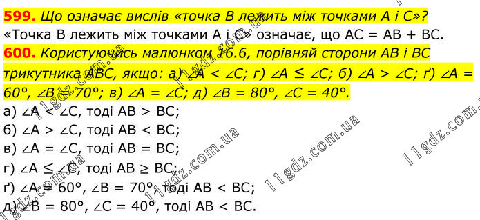 599. Що означає вислів «точка B лежить між точками A і C»? «Точка В лежить між точками А і С» означає, що АС = АВ + ВС. 600. Користуючись малюнком 16.6, порівняй сторони AB і BC трикутника ABC, якщо: а) ∠A < ∠C; г) ∠A ≤ ∠C; б) ∠A > ∠C; ґ) ∠A = 60°, ∠B = 70°; в) ∠A = ∠C; д) ∠B = 80°, ∠C = 40°. а) ∠А < ∠С, тоді АВ > ВС; б) ∠А > ∠С, тоді АВ < ВС; в) ∠А = ∠С, тоді АВ = ВС; г) ∠А ≤ ∠С, тоді АВ ≥ ВС; ґ) ∠А = 60°, ∠В = 70°, тоді АВ < ВС; д) ∠В = 80°, ∠С = 40°, тоді АВ < ВС.