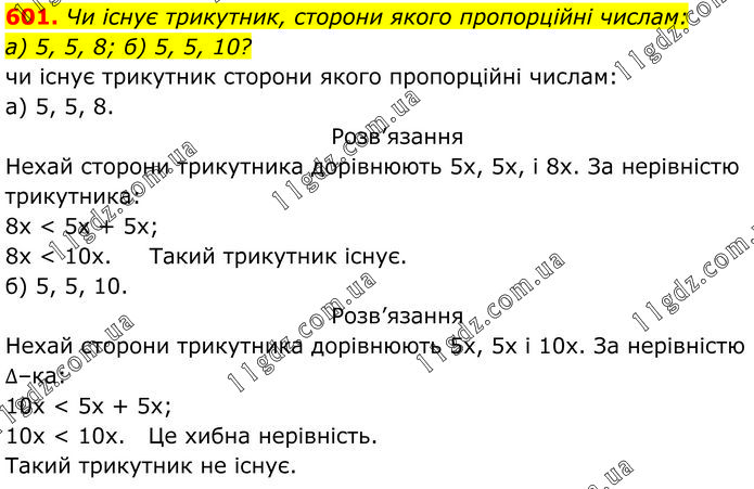Чи існує трикутник, сторони якого пропорційні числам: а) 5, 5, 8; б) 5, 5, 10? чи існує трикутник сторони якого пропорційні числам: а) 5, 5, 8. Розв’язання Нехай сторони трикутника дорівнюють 5x, 5x, і 8х. За нерівністю трикутника: 8х < 5x + 5x; 8х < 10x. Такий трикутник існує. б) 5, 5, 10. Розв’язання Нехай сторони трикутника дорівнюють 5х, 5х і 10х. За нерівністю ∆–ка: 10х < 5x + 5x; 10x < 10x. Це хибна нерівність. Такий трикутник не існує.