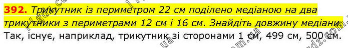 Трикутник із периметром 22 см поділено медіаною на два трикутники з периметрами 12 см і 16 см. Знайдіть довжину медіани. Так, існує, наприклад, трикутник зі сторонами 1 см, 499 см, 500 см.
