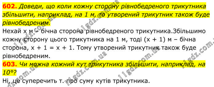 602. Доведи, що коли кожну сторону рівнобедреного трикутника збільшити, наприклад, на 1 м, то утворений трикутник також буде рівнобедреним. Нехай х м – бічна сторона рівнобедреного трикутника.Збільшимо кожну сторону цього трикутника на 1 м, тоді (х + 1) м – бічна сторона, х + 1 = х + 1. Тому утворений трикутник також буде рівнобедреним. 603. Чи можна кожний кут трикутника збільшити, наприклад, на 10°? Ні, це суперечить т. про суму кутів трикутника.