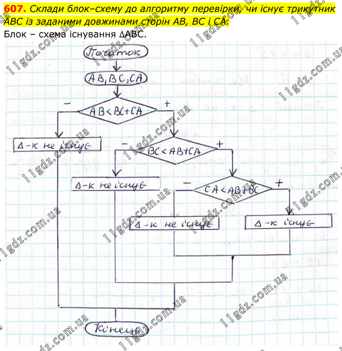 Склади блок–схему до алгоритму перевірки, чи існує трикутник АВС із заданими довжинами сторін АВ, ВС і СA. Блок – схема існування ∆АВС.