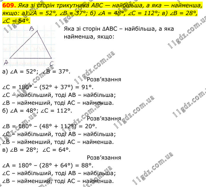 Яка зі сторін трикутника ABC — найбільша, а яка — найменша, якщо: а) ∠A = 52°, ∠B = 37°; б) ∠A = 48°, ∠C = 112°; в) ∠B = 28°, ∠C = 64°. Яка зі сторін ∆АВС – найбільша, а яка найменша, якщо: а) ∠А = 52°; ∠В = 37°. Розв’язання ∠С = 180° – (52° + 37°) = 91°. ∠С – найбільший, тоді АВ – найбільша; ∠В – найменший, тоді АС – найменша. б) ∠А = 48°; ∠С = 112°. Розв’язання ∠В = 180° – (48° + 112°) = 20°. ∠С – найбільший, тоді АВ – найбільша; ∠В – найменший, тоді АС – найменша. в) ∠В = 28°; ∠С = 64°. Розв’язання ∠А = 180° – (28° + 64°) = 88°. ∠С – найбільший, тоді АВ – найбільша; ∠В – найменший, тоді АС – найменша.