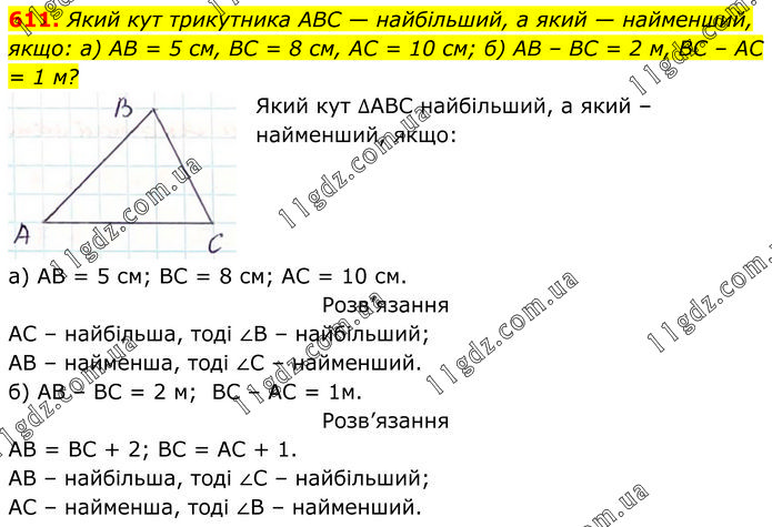 Який кут трикутника ABC — найбільший, а який — найменший, якщо: а) AB = 5 см, BC = 8 см, AC = 10 см; б) AB – BC = 2 м, BC – AC = 1 м? Який кут ∆АВС найбільший, а який – найменший, якщо: а) АВ = 5 см; ВС = 8 см; АС = 10 см. Розв’язання АС – найбільша, тоді ∠В – найбільший; АВ – найменша, тоді ∠С – найменший. б) АВ – ВС = 2 м; ВС – АС = 1м. Розв’язання АВ = ВС + 2; ВС = АС + 1. АВ – найбільша, тоді ∠С – найбільший; АС – найменша, тоді ∠В – найменший.