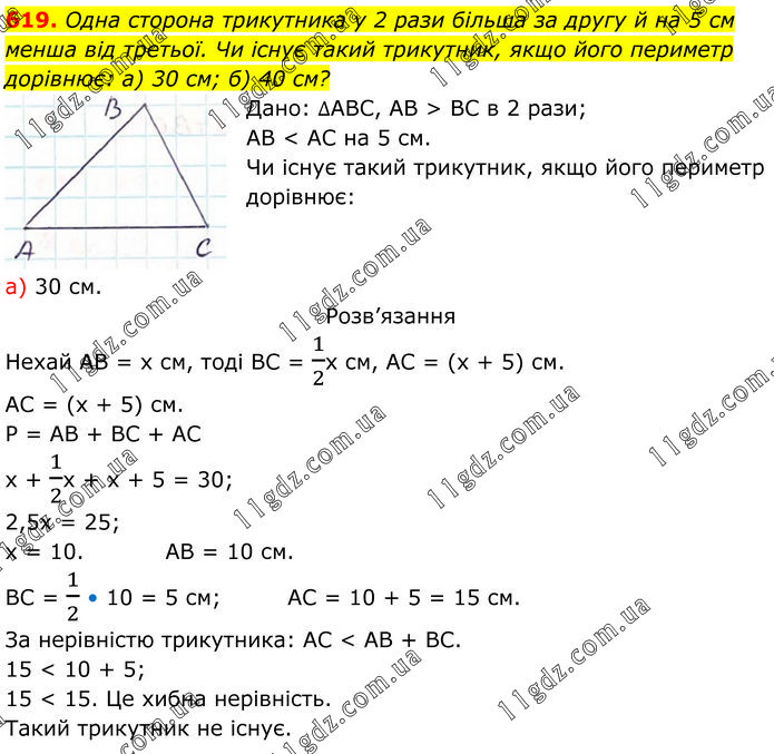 Одна сторона трикутника у 2 рази більша за другу й на 5 см менша від третьої. Чи існує такий трикутник, якщо його периметр дорівнює: а) 30 см; б) 40 см? Дано: ∆АВС, АВ > ВС в 2 рази; АВ < АС на 5 см. Чи існує такий трикутник, якщо його периметр дорівнює: а) 30 см. Розв’язання Нехай АВ = х см, тоді ВС = 1/2х см, АС = (х + 5) см. АС = (х + 5) см. Р = АВ + ВС + АС х + 1/2х + х + 5 = 30; 2,5х = 25; х = 10. АВ = 10 см. ВС = 1/2 • 10 = 5 см; АС = 10 + 5 = 15 см. За нерівністю трикутника: АС < AB + BC. 15 < 10 + 5; 15 < 15. Це хибна нерівність. Такий трикутник не існує.