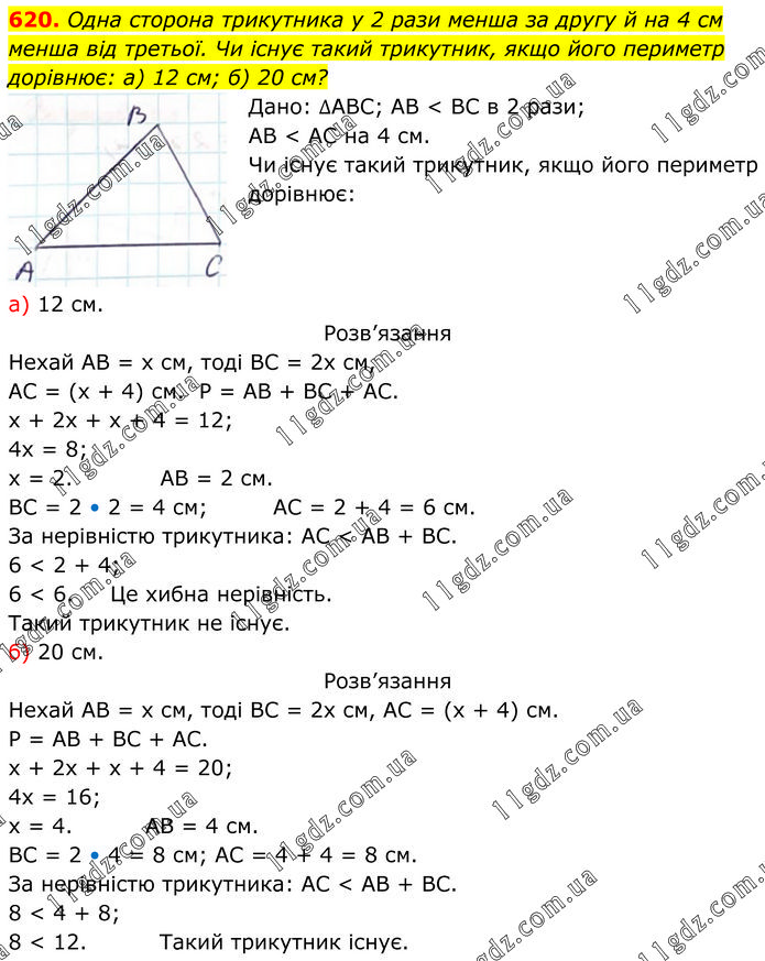 Одна сторона трикутника у 2 рази менша за другу й на 4 см менша від третьої. Чи існує такий трикутник, якщо його периметр дорівнює: а) 12 см; б) 20 см? Дано: ∆АВС; АВ < BC в 2 рази; АВ < АС на 4 см. Чи існує такий трикутник, якщо його периметр дорівнює: а) 12 см. Розв’язання Нехай АВ = х см, тоді ВС = 2х см, АС = (х + 4) см. Р = АВ + ВС + АС. х + 2х + х + 4 = 12; 4х = 8; х = 2. АВ = 2 см. ВС = 2 • 2 = 4 см; АС = 2 + 4 = 6 см. За нерівністю трикутника: АС < АВ + ВС. 6 < 2 + 4; 6 < 6. Це хибна нерівність. Такий трикутник не існує. б) 20 см. Розв’язання Нехай АВ = х см, тоді ВС = 2х см, АС = (х + 4) см. Р = АВ + ВС + АС. х + 2х + х + 4 = 20; 4х = 16; х = 4. АВ = 4 см. ВС = 2 • 4 = 8 см; АС = 4 + 4 = 8 см. За нерівністю трикутника: АС < АВ + ВС. 8 < 4 + 8; 8 < 12. Такий трикутник існує.