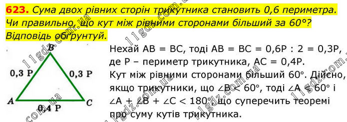 Сума двох рівних сторін трикутника становить 0,6 периметра. Чи правильно, що кут між рівними сторонами більший за 60°? Відповідь обґрунтуй. Нехай АВ = ВС, тоді АВ = ВС = 0,6Р : 2 = 0,3Р, де Р – периметр трикутника, АС = 0,4Р. Кут між рівними сторонами більший 60°. Дійсно, якщо трикутники, що ∠В < 60°, тоді ∠А < 60° і ∠А + ∠В + ∠С < 180°, що суперечить теоремі про суму кутів трикутника.