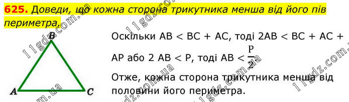 Доведи, що кожна сторона трикутника менша від його пів периметра. Оскільки АВ < ВС + АС, тоді 2АВ < ВС + АС + АР або 2 АВ < Р, тоді АВ < Р/2. Отже, кожна сторона трикутника менша від половини його периметра.