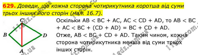 Доведи, що кожна сторона чотирикутника коротша від суми трьох інших його сторін (мал. 16.7). Оскільки АВ < ВС + АС, АС < СD + АD, то АВ < ВС + АС < ВС + (СD + AD) = BC + CD + AD. Отже, AB < BC + CD + AD. Таким чином, кожна сторона чотирикутника менша від суми трьох інших сторін.