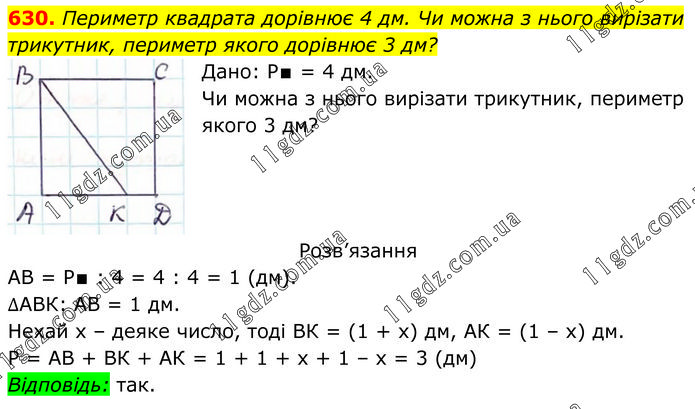 Периметр квадрата дорівнює 4 дм. Чи можна з нього вирізати трикутник, периметр якого дорівнює 3 дм? Дано: Р∎ = 4 дм. Чи можна з нього вирізати трикутник, периметр якого 3 дм? Розв’язання АВ = Р∎ : 4 = 4 : 4 = 1 (дм). ∆АВК: АВ = 1 дм. Нехай х – деяке число, тоді ВК = (1 + х) дм, АК = (1 – х) дм. Р = АВ + ВК + АК = 1 + 1 + х + 1 – х = 3 (дм) Відповідь: так.