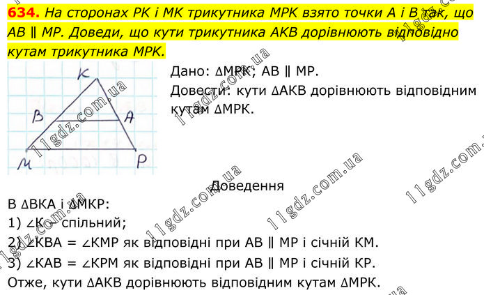 На сторонах PK і MK трикутника MPK взято точки А і В так, що AB ∥ MP. Доведи, що кути трикутника АKВ дорівнюють відповідно кутам трикутника MPK. Дано: ∆МРК; АВ ∥ МР. Довести: кути ∆АКВ дорівнюють відповідним кутам ∆МРК. Доведення В ∆ВКА і ∆МКР: 1) ∠К – спільний; 2) ∠КВА = ∠КМР як відповідні при АВ ∥ МР і січній КМ. 3) ∠КАВ = ∠КРМ як відповідні при АВ ∥ МР і січній КР. Отже, кути ∆АКВ дорівнюють відповідним кутам ∆МРК.