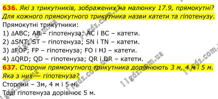 636. Які з трикутників, зображених на малюнку 17.9, прямокутні? Для кожного прямокутного трикутника назви катети та гіпотенузу. Прямокутні трикутники: 1) ∆АВС; АВ – гіпотенуза; АС і ВС – катети. 2) ∆SNT; ST – гіпотенуза; SN i TN – катети. 3) ∆FOP; FP – гіпотенуза; FO i HJ – катети. 4) ∆QRD; QD – гіпотенуза; QR i DR – катети. 637. Сторони прямокутного трикутника дорівнюють 3 м, 4 м і 5 м. Яка з них — гіпотенуза? Сторони – 3м, 4 м і 5 м. Тоді гіпотенуза дорівнює 5 м.