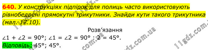 У конструкціях підпірок для полиць часто використовують рівнобедрені прямокутні трикутники. Знайди кути такого трикутника (мал. 17.10). Розв’язання ∠1 + ∠2 = 90°; ∠1 = ∠2 = 90° : 2 = 45°. Відповідь: 45°; 45°.