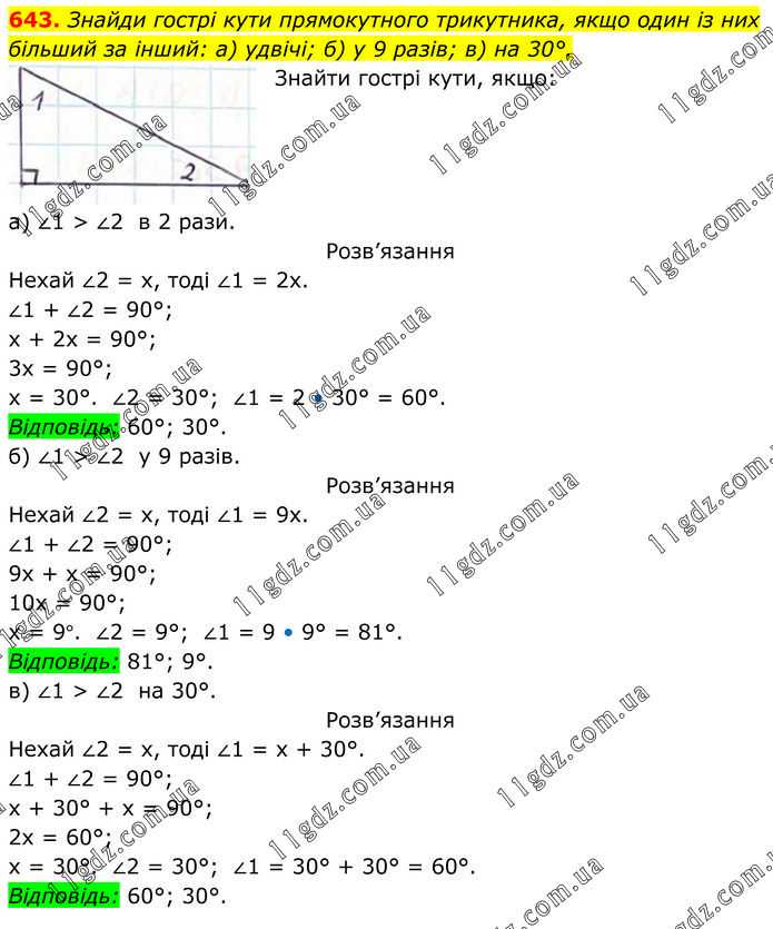 Знайди гострі кути прямокутного трикутника, якщо один із них більший за інший: а) удвічі; б) у 9 разів; в) на 30°. Знайти гострі кути, якщо: а) ∠1 > ∠2 в 2 рази. Розв’язання Нехай ∠2 = х, тоді ∠1 = 2х. ∠1 + ∠2 = 90°; х + 2х = 90°; 3х = 90°; х = 30°. ∠2 = 30°; ∠1 = 2 • 30° = 60°. Відповідь: 60°; 30°. б) ∠1 > ∠2 у 9 разів. Розв’язання Нехай ∠2 = х, тоді ∠1 = 9х. ∠1 + ∠2 = 90°; 9х + х = 90°; 10х = 90°; х = 9°. ∠2 = 9°; ∠1 = 9 • 9° = 81°. Відповідь: 81°; 9°. в) ∠1 > ∠2 на 30°. Розв’язання Нехай ∠2 = х, тоді ∠1 = х + 30°. ∠1 + ∠2 = 90°; х + 30° + х = 90°; 2х = 60°; х = 30°. ∠2 = 30°; ∠1 = 30° + 30° = 60°. Відповідь: 60°; 30°.