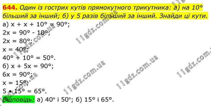 Один із гострих кутів прямокутного трикутника: а) на 10° більший за інший; б) у 5 разів більший за інший. Знайди ці кути. а) х + х + 10° = 90°; 2х = 90° - 10°; 2х = 80°; х = 40°; 40° + 10° = 50°. б) х + 5х = 90°; 6х = 90°; х = 15°; 5 • 15° = 65°. Відповідь: а) 40° і 50°; б) 15° і 65°.