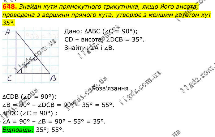 Знайди кути прямокутного трикутника, якщо його висота, проведена з вершини прямого кута, утворює з меншим катетом кут 35°. Дано: ∆АВС (∠С = 90°); СD – висота; ∠DCB = 35°. Знайти: ∠А і ∠В. Розв’язання ∆CDB (∠D = 90°): ∠B = 90° – ∠DCB = 90° – 35° = 55°. ∆FDC (∠C = 90°) : ∠A = 90° – ∠B = 90° – 55° = 35°. Відповідь: 35°; 55°.