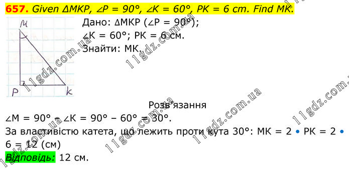 Given ΔMKP, ∠P = 90°, ∠K = 60°, PK = 6 сm. Find MK. Дано: ∆МКР (∠Р = 90°); ∠К = 60°; РК = 6 см. Знайти: МК. Розв’язання ∠М = 90° – ∠К = 90° – 60° = 30°. За властивістю катета, що лежить проти кута 30°: МК = 2 • РК = 2 • 6 = 12 (см) Відповідь: 12 см.
