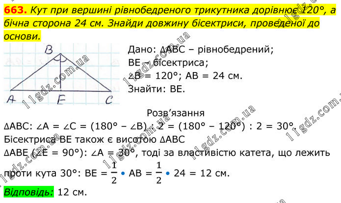 Кут при вершині рівнобедреного трикутника дорівнює 120°, а бічна сторона 24 см. Знайди довжину бісектриси, проведеної до основи. Дано: ∆АВС – рівнобедрений; ВЕ – бісектриса; ∠В = 120°; АВ = 24 см. Знайти: ВЕ. Розв’язання ∆АВС: ∠А = ∠С = (180° – ∠В) : 2 = (180° – 120°) : 2 = 30°. Бісектриса ВЕ також є висотою ∆АВС ∆АВЕ (∠Е = 90°): ∠А = 30°, тоді за властивістю катета, що лежить проти кута 30°: ВЕ = 1/2 • АВ = 1/2 • 24 = 12 см. Відповідь: 12 см.