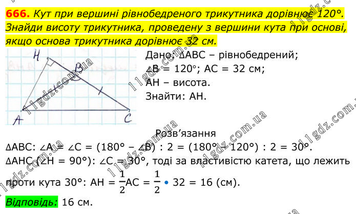 Кут при вершині рівнобедреного трикутника дорівнює 120°. Знайди висоту трикутника, проведену з вершини кута при основі, якщо основа трикутника дорівнює 32 см. Дано: ∆АВС – рівнобедрений; ∠В = 120°; АС = 32 см; АН – висота. Знайти: АН. Розв’язання ∆АВС: ∠А = ∠С = (180° – ∠В) : 2 = (180° – 120°) : 2 = 30°. ∆АНС (∠Н = 90°): ∠С = 30°, тоді за властивістю катета, що лежить проти кута 30°: АН = 1/2АС = 1/2 • 32 = 16 (см). Відповідь: 16 см.