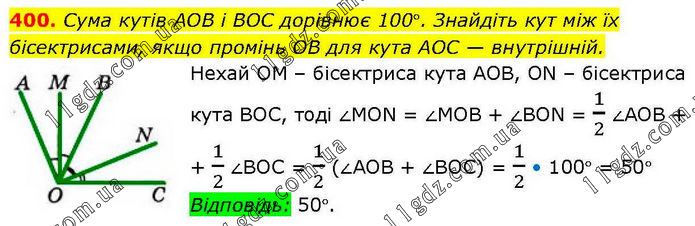 Сума кутів AOB і BOC дорівнює 100°. Знайдіть кут між їх бісектрисами, якщо промінь OB для кута AOC — внутрішній. Нехай ОМ – бісектриса кута АОВ, ON – бісектриса кута ВОС, тоді ∠MON = ∠MOB + ∠BON = 1/2 ∠AOB + 1/2 ∠BOC = 1/2 (∠AOB + ∠BOC) = 1/2 • 100° = 50° Відповідь: 50°.