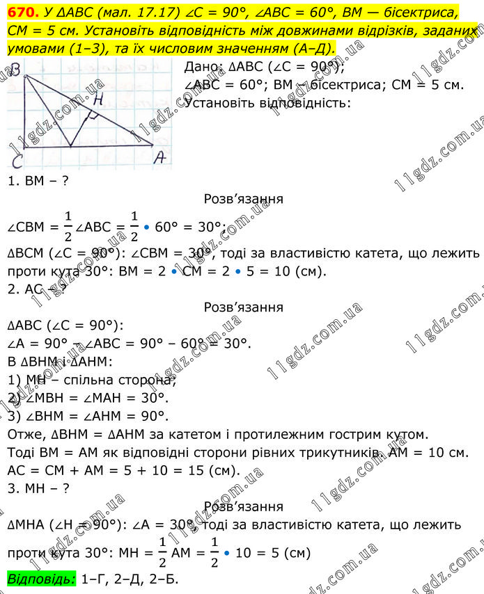 У ΔABC (мал. 17.17) ∠C = 90°, ∠ABC = 60°, ВМ — бісектриса, СМ = 5 см. Установіть відповідність між довжинами відрізків, заданих умовами (1–3), та їх числовим значенням (А–Д). Дано: ∆АВС (∠С = 90°); ∠АВС = 60°; ВМ – бісектриса; СМ = 5 см. Установіть відповідність: 1. ВМ – ? Розв’язання ∠СВМ = 1/2∠АВС = 1/2 • 60° = 30°; ∆ВСМ (∠С = 90°): ∠СВМ = 30°, тоді за властивістю катета, що лежить проти кута 30°: ВМ = 2 • СМ = 2 • 5 = 10 (см). 2. АС – ? Розв’язання ∆АВС (∠С = 90°): ∠А = 90° – ∠АВС = 90° – 60° = 30°. В ∆ВНМ і ∆АНМ: 1) МН – спільна сторона; 2) ∠МВН = ∠МАН = 30°. 3) ∠ВНМ = ∠АНМ = 90°. Отже, ∆ВНМ = ∆АНМ за катетом і протилежним гострим кутом. Тоді ВМ = АМ як відповідні сторони рівних трикутників. АМ = 10 см. АС = СМ + АМ = 5 + 10 = 15 (см). 3. МН – ? Розв’язання ∆МНА (∠Н = 90°): ∠А = 30°, тоді за властивістю катета, що лежить проти кута 30°: МН = 1/2 АМ = 1/2 • 10 = 5 (см). Відповідь: 1–Г, 2–Д, 2–Б.