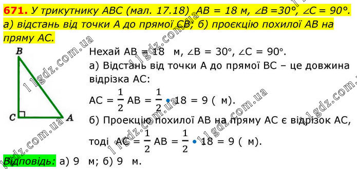 У трикутнику ABC (мал. 17.18) AB = 18 м, ∠B =30°, ∠C = 90°. а) відстань від точки A до прямої CB; б) проєкцію похилої AB на пряму AC. Нехай АВ = 18 см, ∠В = 30°, ∠С = 90°. а) Відстань від точки А до прямої ВС – це довжина відрізка АС: АС = 1/2 АВ = 1/2 • 18 = 9 (м). б) Проекцію похилої АВ на пряму АС є відрізок АС, тоді АС = 1/2 АВ = 1/2 • 18 = 9 (м). Відповідь: а) 9 м; б) 9 м.