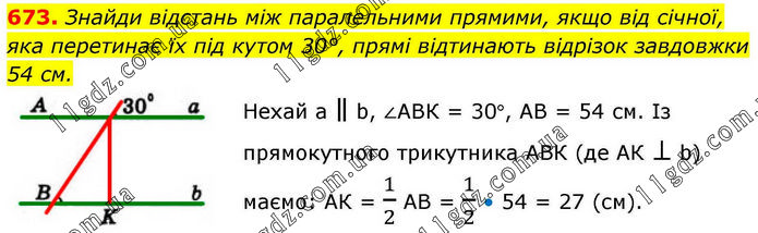 Знайди відстань між паралельними прямими, якщо від січної, яка перетинає їх під кутом 30°, прямі відтинають відрізок завдовжки 54 см. Нехай а ∥ b, ∠АВК = 30°, АВ = 54 см. Із прямокутного трикутника АВК (де АК ⊥ b) маємо: АК = 1/2АВ = 1/2 • 54 = 27 (см).