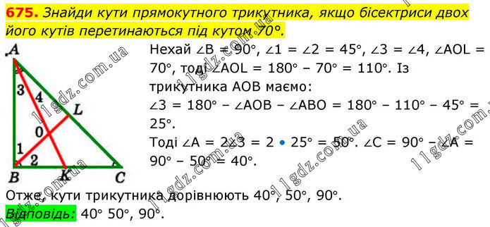 Знайди кути прямокутного трикутника, якщо бісектриси двох його кутів перетинаються під кутом 70°. Нехай ∠В = 90°, ∠1 = ∠2 = 45°, ∠3 = ∠4, ∠AOL = 70°, тоді ∠AOL = 180° – 70° = 110°. Із трикутника АОВ маємо: ∠3 = 180° – ∠АОВ – ∠АВО = 180° – 110° – 45° = 25°. Тоді ∠А = 2∠3 = 2 • 25° = 50°. ∠С = 90° – ∠А = 90° – 50° = 40°. Отже, кути трикутника дорівнюють 40°, 50°, 90°. Відповідь: 40° 50°, 90°.