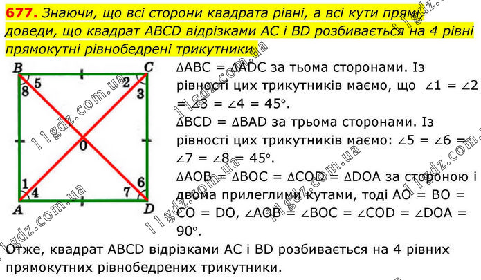 Знаючи, що всі сторони квадрата рівні, а всі кути прямі, доведи, що квадрат ABCD відрізками AC і BD розбивається на 4 рівні прямокутні рівнобедрені трикутники. ∆АВС = ∆ADC за тьома сторонами. Із рівності цих трикутників маємо, що ∠1 = ∠2 = ∠3 = ∠4 = 45°. ∆ВСD = ∆ВAD за трьома сторонами. Із рівності цих трикутників маємо: ∠5 = ∠6 = ∠7 = ∠8 = 45°. ∆AOB = ∆BOC = ∆COD = ∆DOA за стороною і двома прилеглими кутами, тоді АО = ВО = СО = DO, ∠AOB = ∠BOC = ∠COD = ∠DOA = 90°. Отже, квадрат ABCD відрізками АС і ВD розбивається на 4 рівних прямокутних рівнобедрених трикутники.