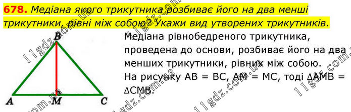 Медіана якого трикутника розбиває його на два менші трикутники, рівні між собою? Укажи вид утворених трикутників. Медіана рівнобедреного трикутника, проведена до основи, розбиває його на два менших трикутники, рівних між собою. На рисунку АВ = ВС, АМ = МС, тоді ∆АМВ = ∆СМВ.