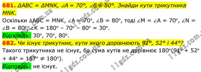 681. ∆АBC = ∆MNK, ∠A = 70°, ∠B = 80°. Знайди кути трикутника MNK. Оскільки ∆АВС = MNK, ∠А = 70°, ∠В = 80°, тоді ∠М = ∠А = 70°, ∠N = ∠B = 80°, ∠K = 180° – 70° – 80° = 30°. Відповідь: 30°, 70°, 80°. 682. Чи існує трикутник, кути якого дорівнюють 91°, 52° і 44°? Такого трикутника не існує, бо сума кутів не дорівнює 180°(91° + 52° + 44° = 187° ≠ 180°). Відповідь: не існує.