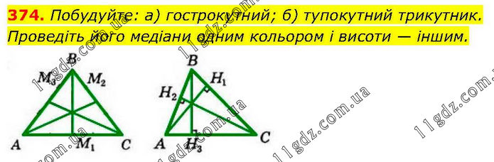 Побудуйте: а) гострокутний; б) тупокутний трикутник. Проведіть його медіани одним кольором і висоти — іншим.