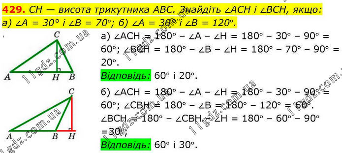CH — висота трикутника ABC. Знайдіть ∠ACH і ∠BCH, якщо: а) ∠A = 30° і ∠B = 70°; б) ∠A = 30° і ∠B = 120°. а) ∠АСН = 180° – ∠А – ∠Н = 180° – 30° – 90° = 60°; ∠ВСН = 180° – ∠В – ∠Н = 180° – 70° – 90° = 20°. Відповідь: 60° і 20°. б) ∠АСН = 180° – ∠А – ∠Н = 180° – 30° – 90° = 60°; ∠СВН = 180° – ∠В = 180° – 120° = 60°. ∠ВСН = 180° – ∠СВН – ∠Н = 180° – 60° – 90° =30°; Відповідь: 60° і 30°.