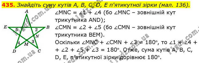 Знайдіть суму кутів A, B, C, D, E п'ятикутної зірки (мал. 136). ∠MNC = ∠1 + ∠4 (бо ∠MNC – зовнішній кут трикутника AND); ∠CMN = ∠2 + ∠5 (бо ∠CMN – зовнішній кут трикутника ВЕМ). Оскільки ∠MNC + ∠CMN + ∠3 = 180°, то ∠1 + ∠4 + + ∠2 + ∠5 + ∠3 = 180°. Отже, сума кутів А, В, С, D, Е, п’ятикутної зірки дорівнює 180°.