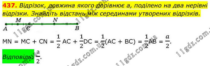Відрізок, довжина якого дорівнює а, поділено на два нерівні відрізки. Знайдіть відстань між серединами утворених відрізків. MN = MC + CN = 1/2 AC + 1/2DC = 1/2(AC + BC) = 1/2AB = a/2. Відповідь: а/2.