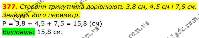Сторони трикутника дорівнюють 3,8 см, 4,5 см і 7,5 см. Знайдіть його периметр. Р = 3,8 + 4,5 + 7,5 = 15,8 (см) Відповідь: 15,8 см.