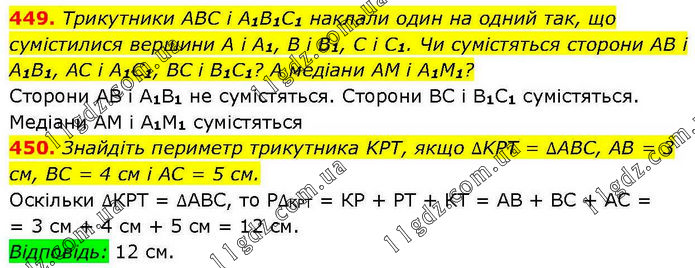 449. Трикутники ABC і A1B1C1 наклали один на одний так, що сумістилися вершини А і A1, В і B1, C і C1. Чи сумістяться сторони AB і A1B1, AC і A1C1, BC і B1C1? А медіани АМ і A1М1? Сторони АВ і А1В1 не сумістяться. Сторони ВС і В1С1 сумістяться. Медіани АМ і А1М1 сумістяться 450. Знайдіть периметр трикутника KPT, якщо ∆KPT = ∆АВС, AB = 3 см, BC = 4 см і AC = 5 см. Оскільки ∆КРТ = ∆АВС, то Р∆КРТ = КР + РТ + КТ = АВ + ВС + АС = = 3 см + 4 см + 5 см = 12 см. Відповідь: 12 см.