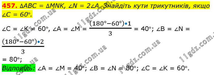 ∆АВС = ∆MNK, ∠N = 2∠A. Знайдіть кути трикутників, якщо ∠C = 60°. ∠С = ∠К = 60°, ∠А = ∠М = ((180°- 60°) • 1)/3 = 40°; ∠В = ∠N = ((180°- 60°) • 2)/3 = 80°. Відповідь: ∠А = ∠М = 40°; ∠В = ∠N = 80°; ∠C = ∠K = 60°.